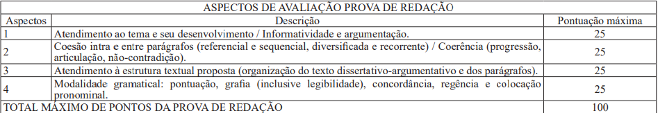 A Redação será avaliada considerando-se os aspectos presentes na tabela seguinte: